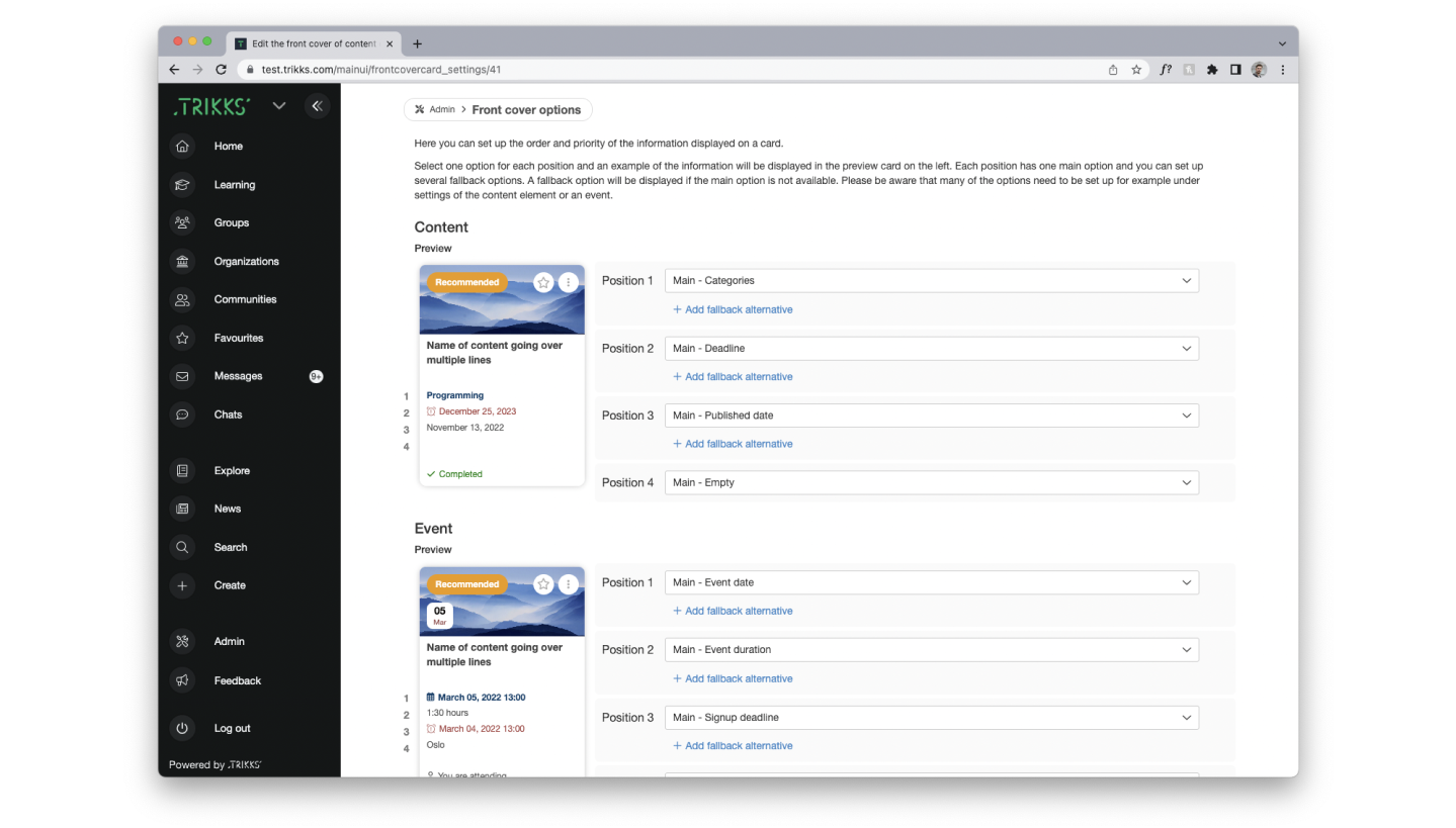 When you are inside, you create a priority list for the information you want to display. ou have four available positions for it. It is also possible to decide what to display when that information is not available. You do this by adding a feedback alternative. Different types of content also have their own choices you can make. The reason for this is that events should perhaps focus on when and where the event will take place but this is not interesting for a digital content element. For content, on the other hand, perhaps things like price, score or tags are more important.